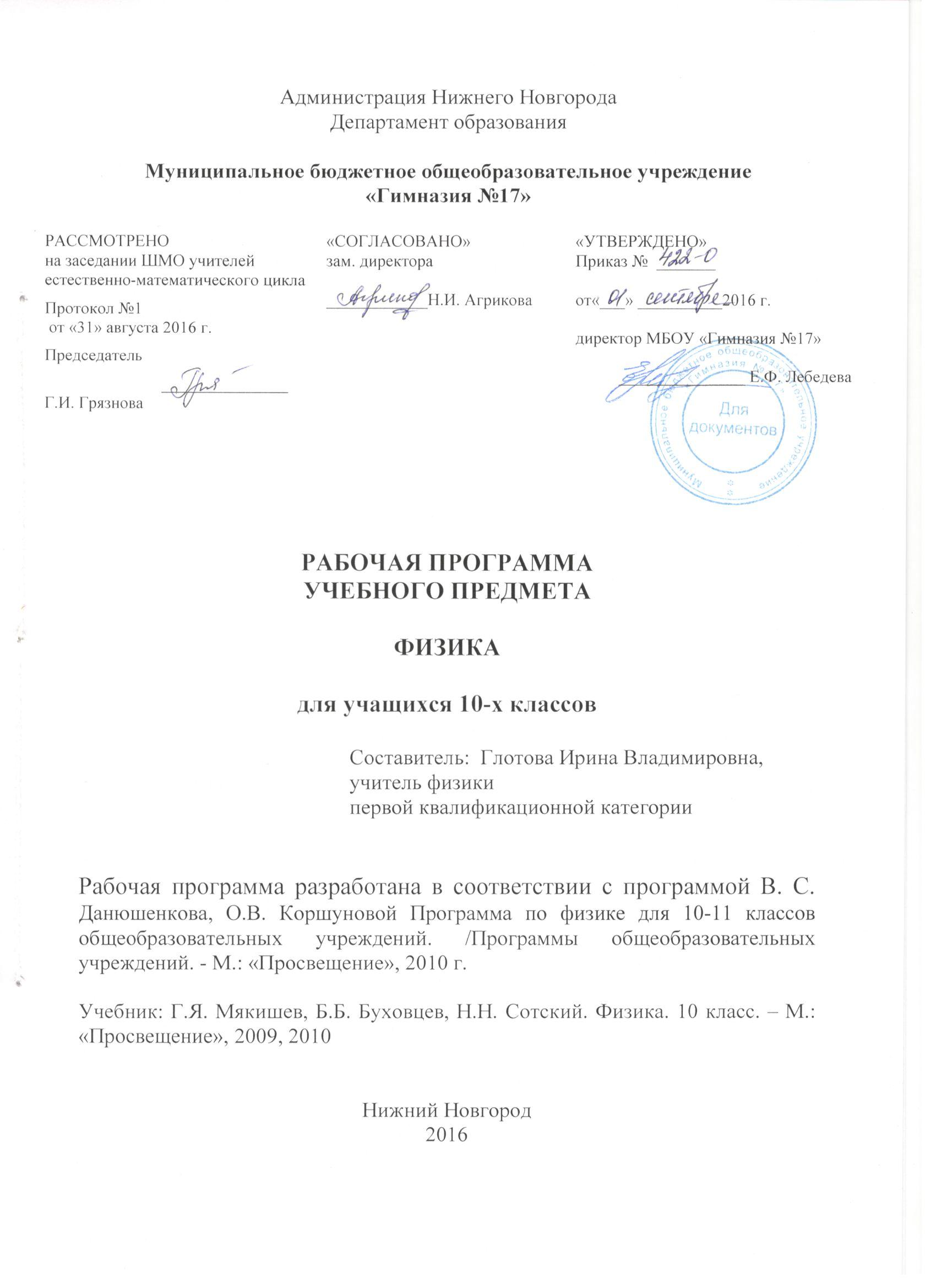 Настоящая рабочая программа по предмету «Физика» для учащихся 10-х классов предназначена для реализации федерального компонента государственного стандарта среднего общего образования и составлена на основе программы: В.С. Данюшенков,