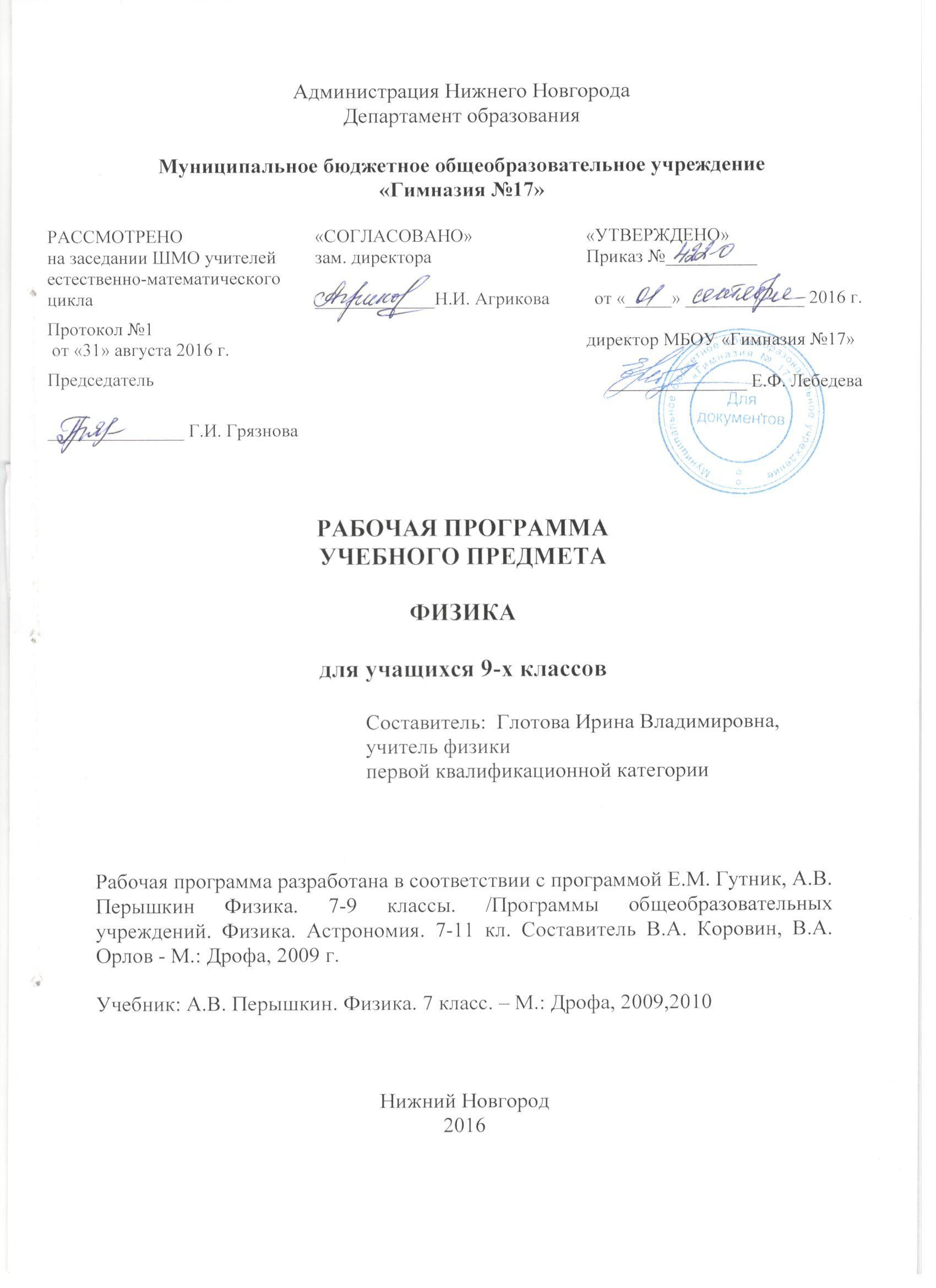 Настоящая рабочая программа по предмету «Физика» для учащихся 9-х классов предназначена для реализации федерального компонента государственного стандарта основного общего образования и составлена на основе программы: Е.М. Гутник,