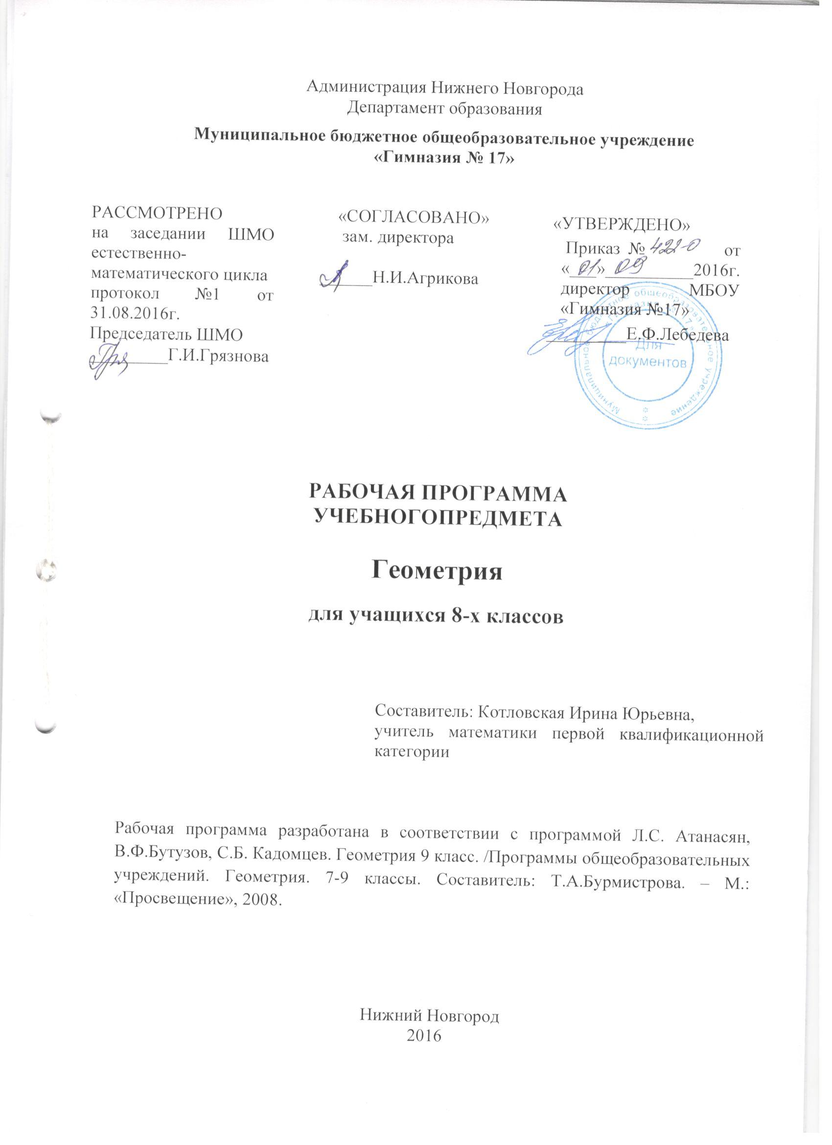 Настоящая рабочая программа по предмету «Геометрия» для учащихся 8 класса предназначена для реализации федерального компонента государственного стандарта основного общего образования и составлена на основе программы: Л.С. Атанасян, В.Ф.Бутузов, С.Б. Кадомцев. Геометрия 8 класс. /Программы общеобразовательных учреждений. Геометрия. 7-9 классы. Составитель: Т.А.Бурмистрова. – М.: «Просвещение», 2008.